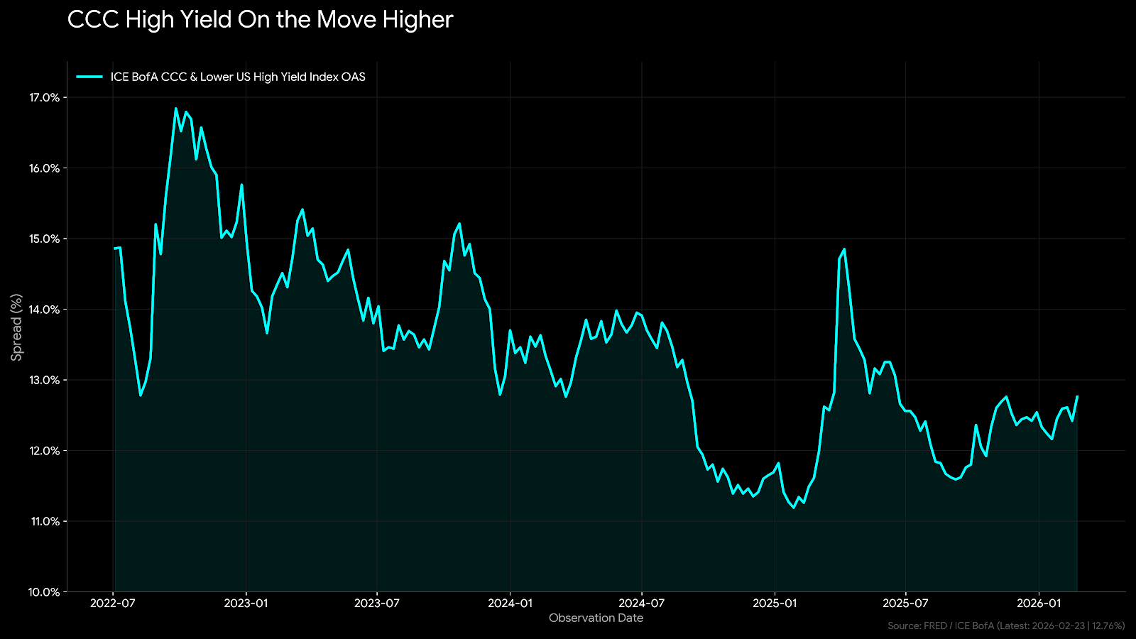 Credit spreads have widened some as bonds have also begun to move higher. With the 10Y hitting a 1-year low this evening - something to keep an eye on with geopolitical volatility and as AI/tech company CDS’ have pushed dramatically higher.
